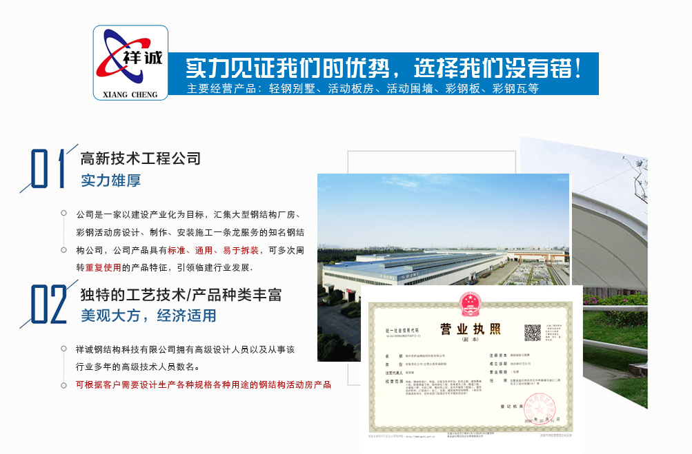 宿州市祥誠鋼結構科技有限公司位于宿州市經開區外環南路與金江二路交叉口北,公司是一家以建設產業化為目標,匯集大型鋼結構廠房、彩鋼活動房設計、制作、安裝施工一條龍服務的知名鋼結構公司。公司現有固定資產1000余萬元、流動資金近千萬元公司?,F有員工40人,大專以上學歷30人,其中高級工程師1人、工程師2人、會計師1名。各工種持證上崗率100%。高效化的年青團隊為公司帶來了蓬勃發展的動力,全體員工以務實的態度,拼搏的精神,創造著企業的每一天。      公司組織結構嚴格按現代企業制度設計,管理機構設置合理,制度完善,各部門分工明確...